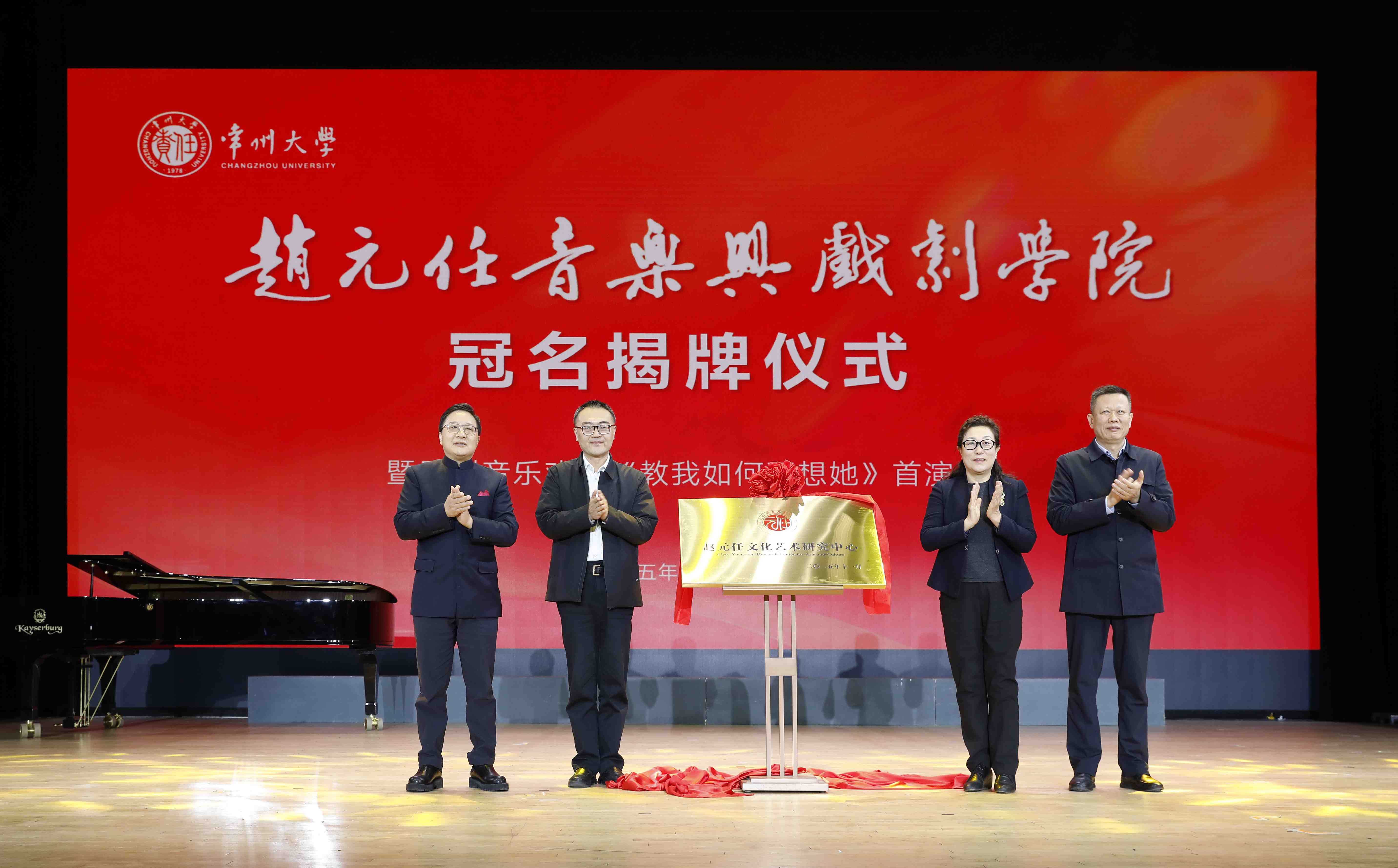11月22日,赵元任音乐与戏剧学院冠名揭牌仪式暨原创音乐戏剧《教我如何不想她》首演在西太湖校区立艺楼礼堂举行。赵元任先生外孙黄家林教授,常州市委常委、宣传部部长陈志良,江苏省教育厅体育卫生与艺术教育处二级调研员王红蕾,清华大学艺术教育中心主任赵洪,常州市委宣传部副部长谢春林,常州市文学艺术界联合会党组书记、主席沈玉俊,常州市委宣传部办公室主任魏火军,江苏晋陵文旅发展集团有限公司董事长苏刚,内蒙古自治区教育厅美育指导委员会秘书长张卉,上海市学校体育与艺术发展评估中心常务副主任张欢,常州大学党委书记徐守坤,常州大学党委副书记黄海燕,常州大学党委常委、副校长杨琳出席仪式,常州市和武进区相关部门领导、上海音乐学院及省内兄弟院校音乐学院的领导和专家、学校相关职能部门和相关学院负责人、赵元任音乐与戏剧学院全体师生等齐聚一堂,共同见证这一重要时刻。黄海燕主持仪式。