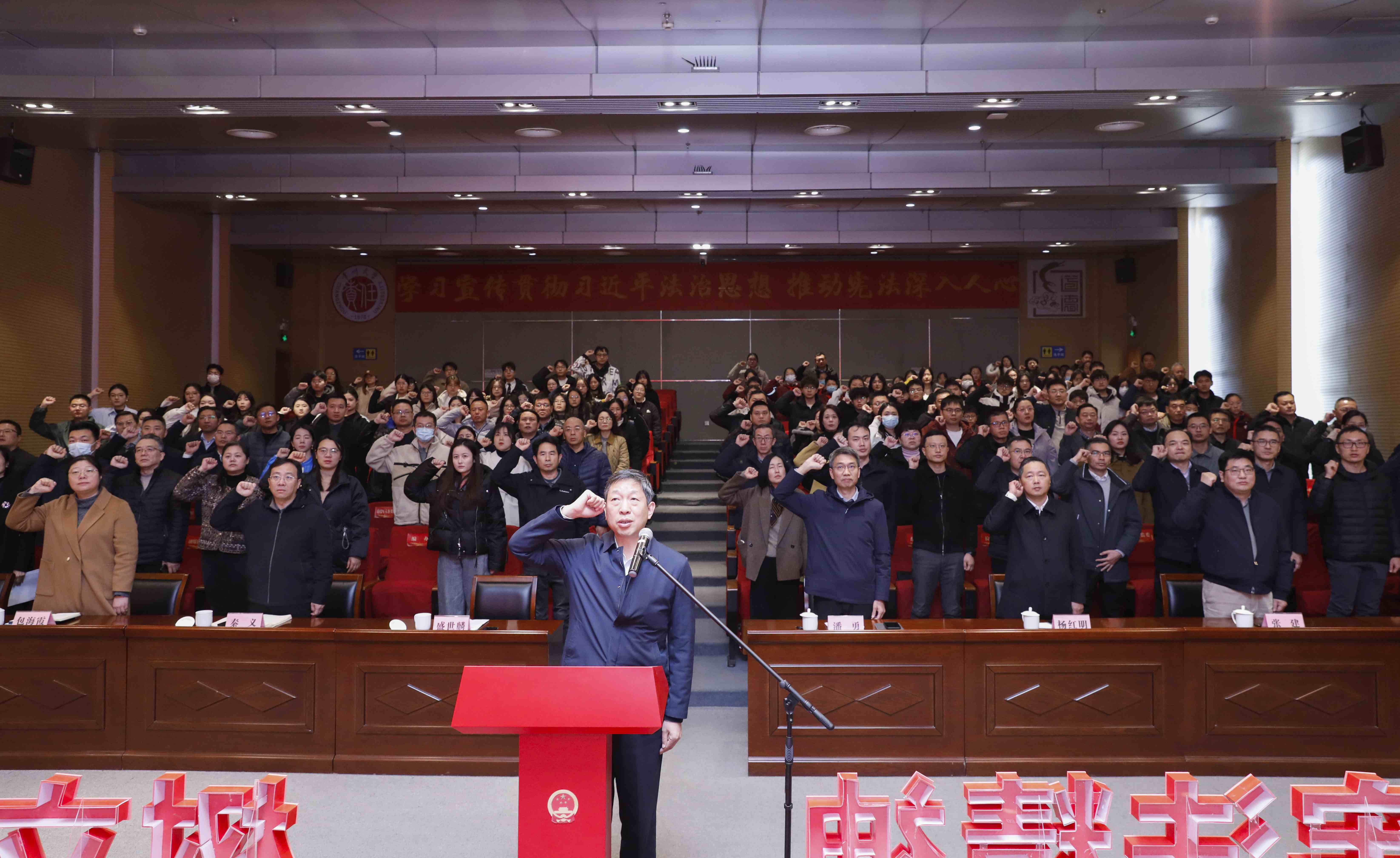 为深入学习宣传贯彻习近平法治思想,推动宪法深入人心,12月4日上午,由中共常州市武进区委全面依法治区委员会主办,常州市武进区司法局和常州大学共同承办的武进区第十二个国家宪法日主题宣传活动在我校科教城校区举行。武进区人民政府副区长盛世麟,常州大学党委常委、副校长潘勇,党委常委、组织部部长秦义,武进区司法局党组书记、局长杨红明,武进区政法系统,各镇(街道)和普法成员单位分管领导,我校相关职能部门负责人及师生代表及常州大学附属小学师生代表参加活动。