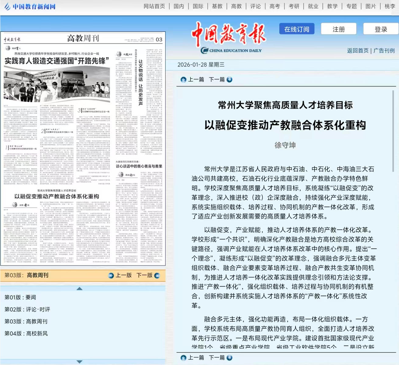1月28日,《中国教育报》以“常州大学聚焦高质量人才培养目标 以融促变推动产教融合体系化重构”为题刊发我校党委书记徐守坤署名文章。文章从“融合多元主体,强化功能再造,布局一体化组织载体”“ 融合产业要素,优化能力适配,重塑一体化培养过程”“融合产教共生,深化敏捷协同,创新一体化协同机制”等方面,系统阐述了常州大学以“以融促变”为核心理念,通过体系化重构打通产教融合关键环节,构建适应产业创新发展需求的高质量人才培养体系的创新实践与系统布局。全文内容如下: